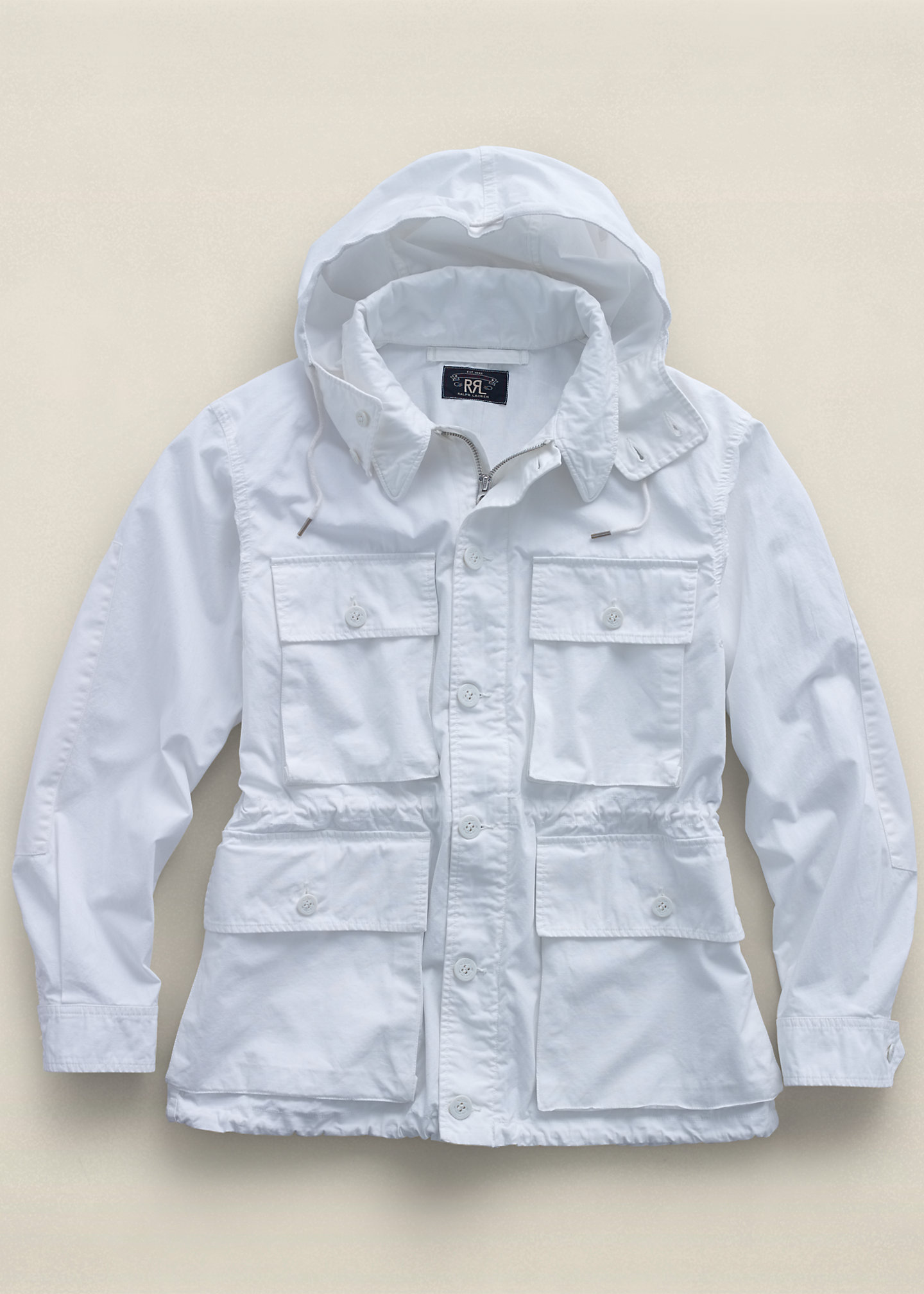 Lightly rinsed for an authentic, worn-in look. Stowaway hood. Drawstrings for cinching at waist and hem.