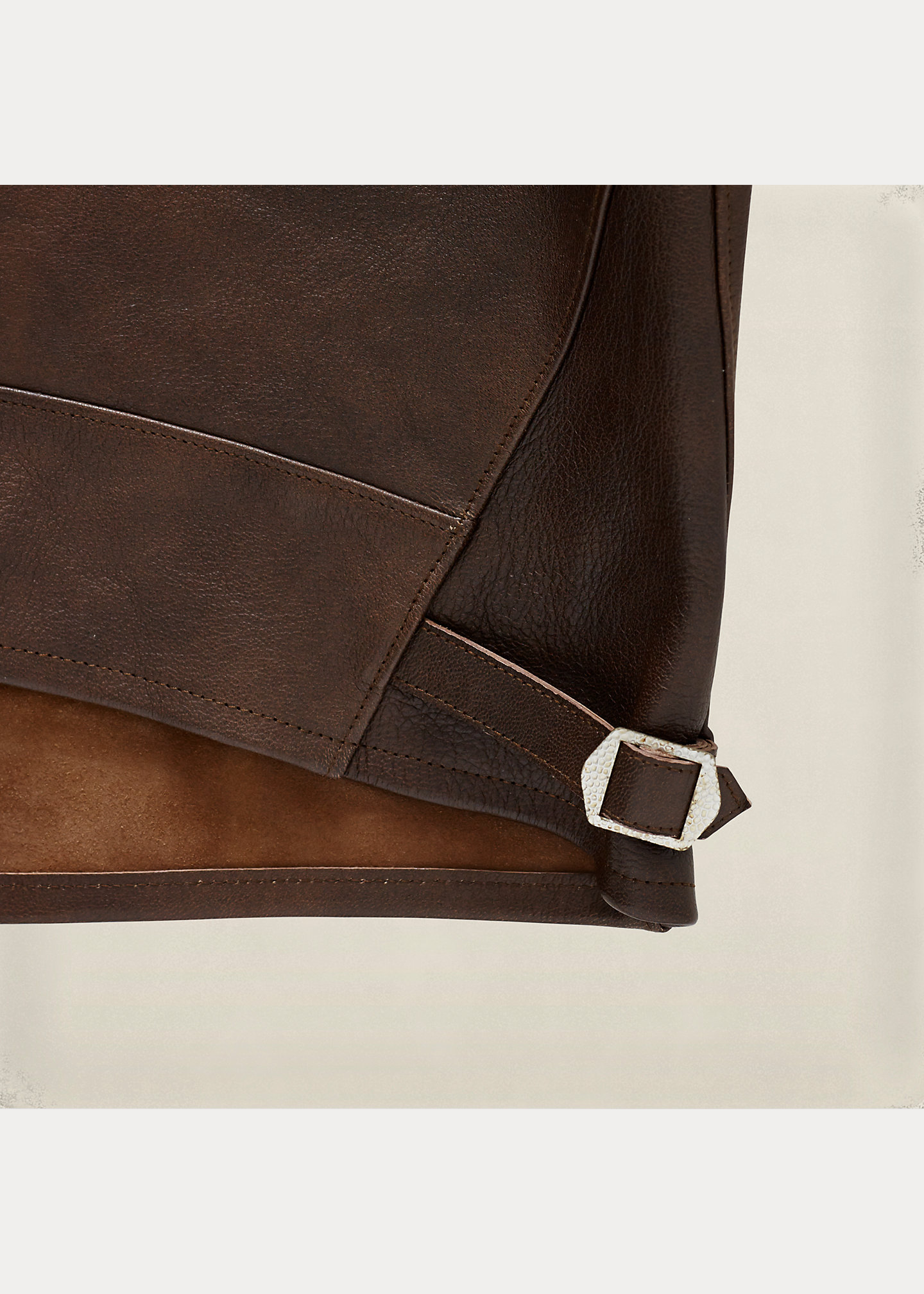 Club collar. Seven-button placket. Corozo buttons. Long sleeves. Buttoned tabs at the cuffs. Ventilating embroidered grommets at the under arms. Buttoned-flap patch pockets at the waist. Buckled tabs at the back left and right hem. Unlined. 100% goat leather. Professionally dry clean by a leather and suede expert. Imported.