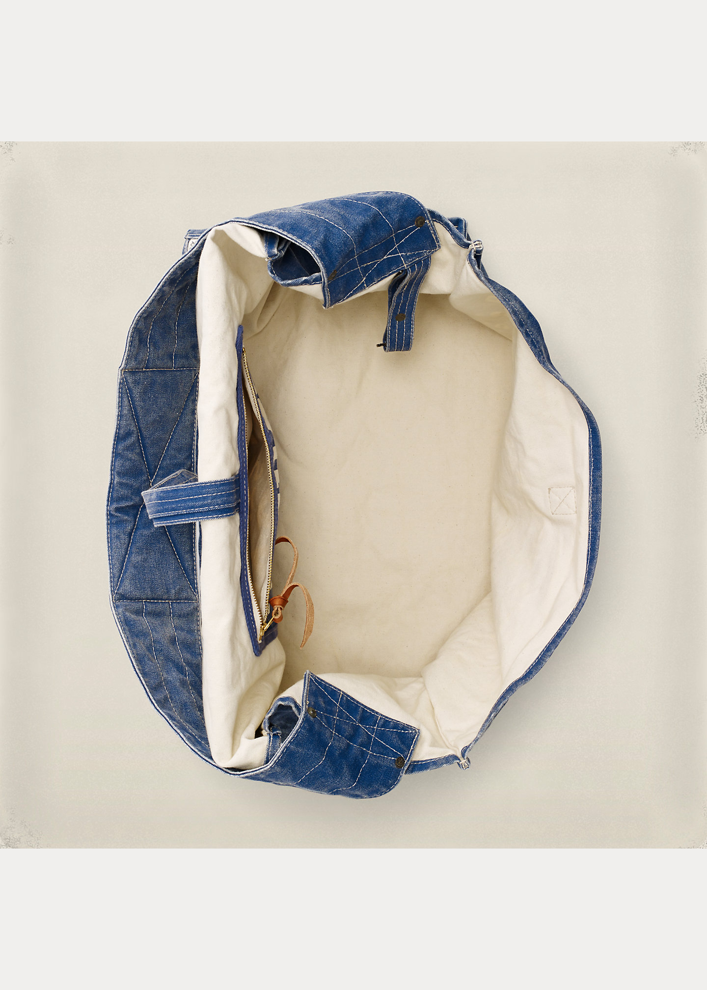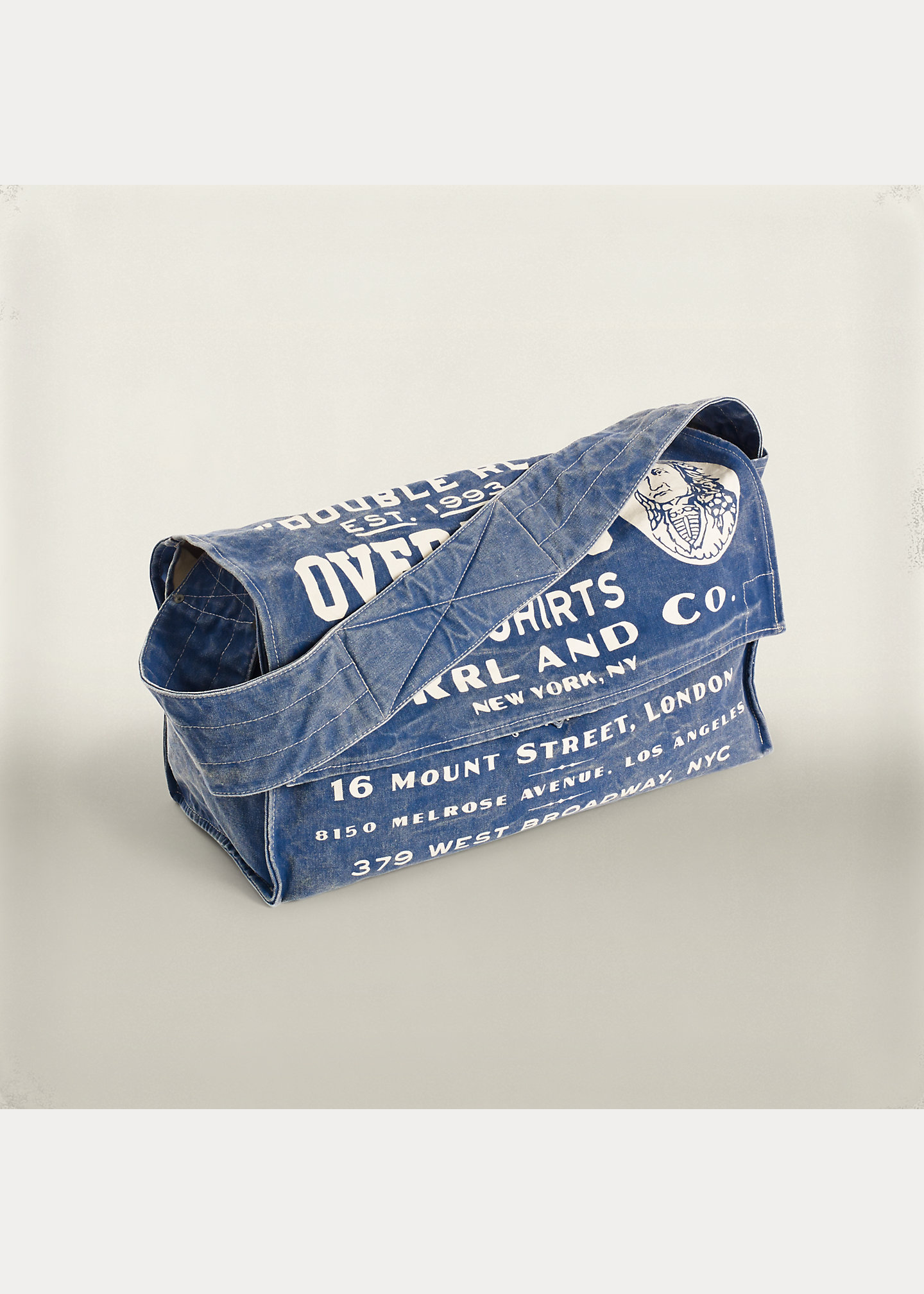 Porter bag made from rugged cotton canvas that is washed to give it a worn-in appearance. Modeled after early-20th-century newspaper bags and designed with an allover vintage-inspired screen-print.