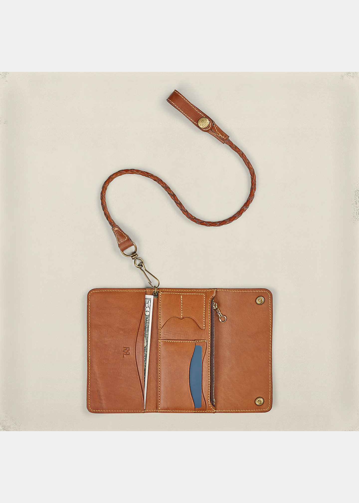 Single braided-leather wristlet strap. Front fold-over flap with a snapped closure. Tooled thunderbird-shaped design accents the front. Leather interior features two full currency pockets, two card slots and a zip pocket. 4" h x 7" l x ½" d. leather. Imported.