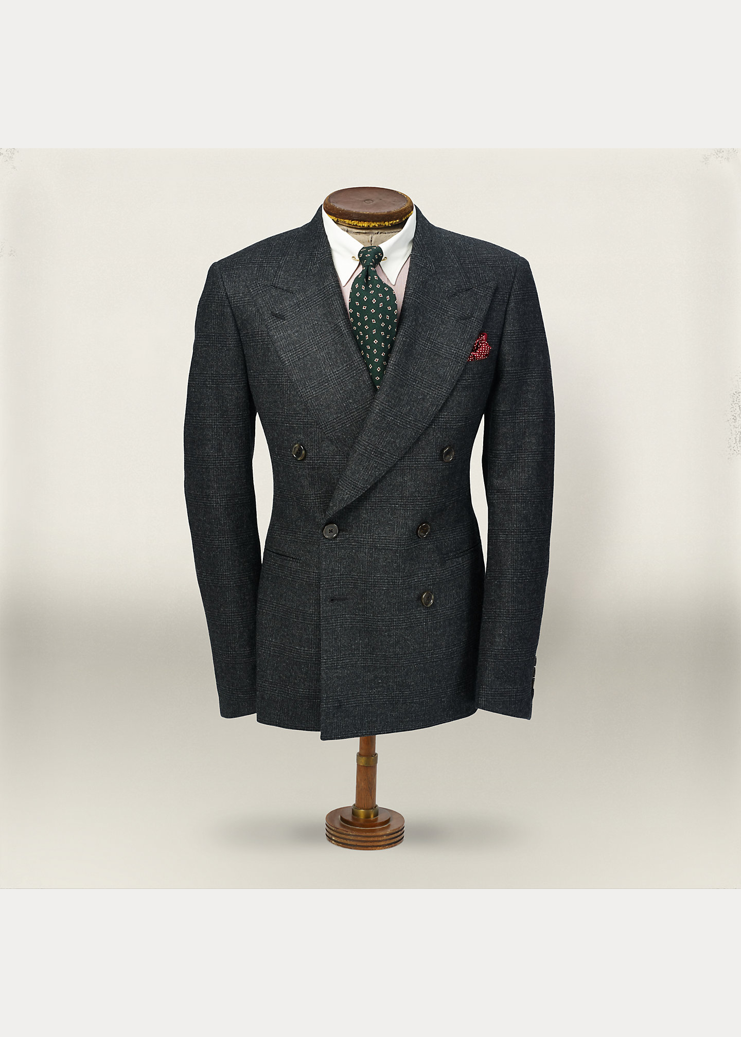 Wide peaked lapels. Double-breasted silhouette. Genuine horn buttons. Long sleeves with a four-button detail at each cuff. Welt pocket at the left chest. Besom pockets at the waist. Interior besom pocket at the left chest and waist. Interior buttoned besom pocket at the right chest. Clean-finished hem. Fully lined. Shell: 100% wool. Body lining: 51% cotton; 49% viscose. Sleeve lining: 100% cupro. Dry clean. Made in italy. Alterations available in ralph lauren retail stores.