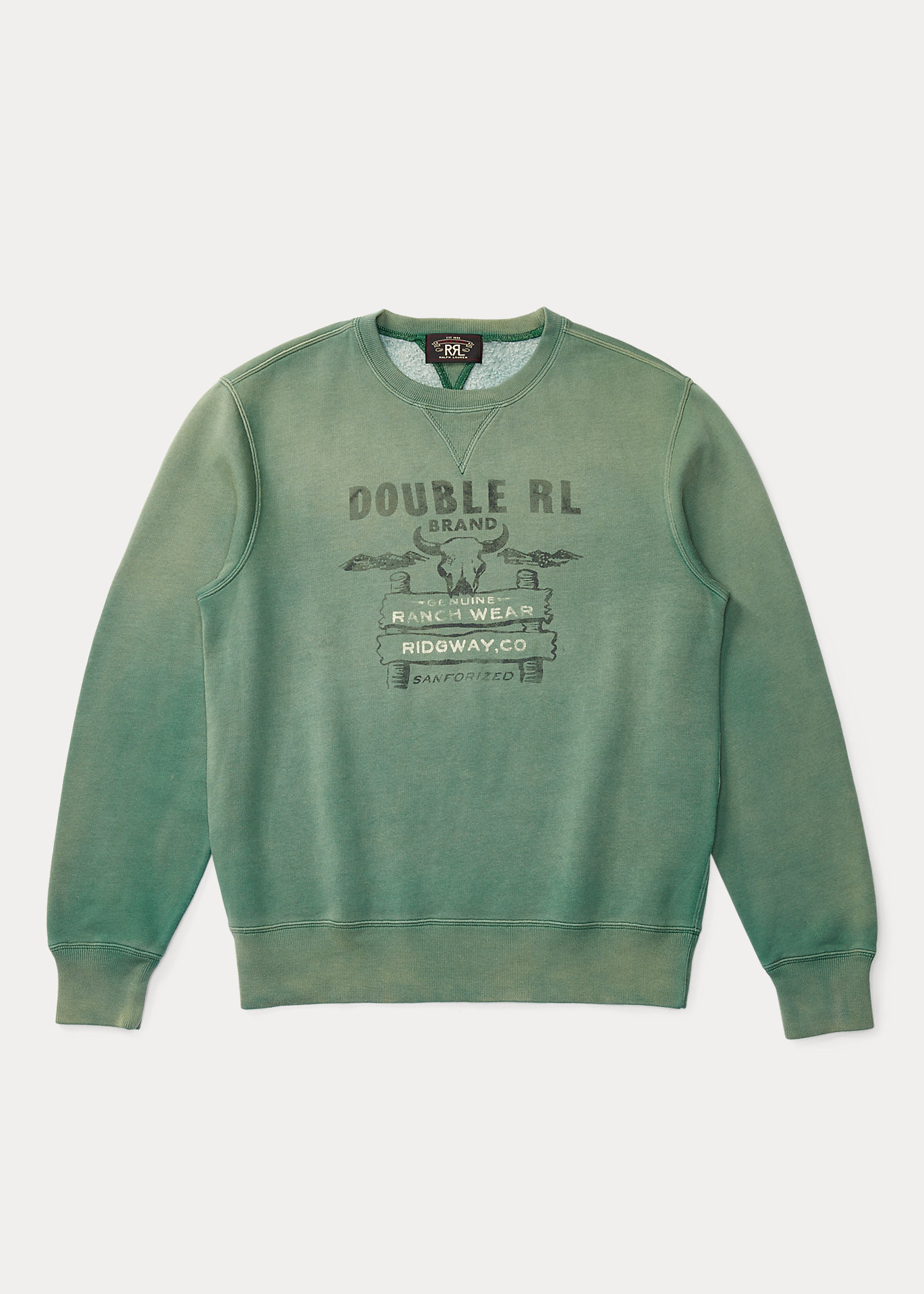 Size medium has a 26½" body length and a 34¾" sleeve length. Sleeve length is taken from the center back of the neck. Crewneck with a double V-inset. Long sleeves with ribbed cuffs. "Double RL Brand" screen-printed at the center front. Ribbed hem. 81% cotton, 19% polyester. Machine washable. Imported.