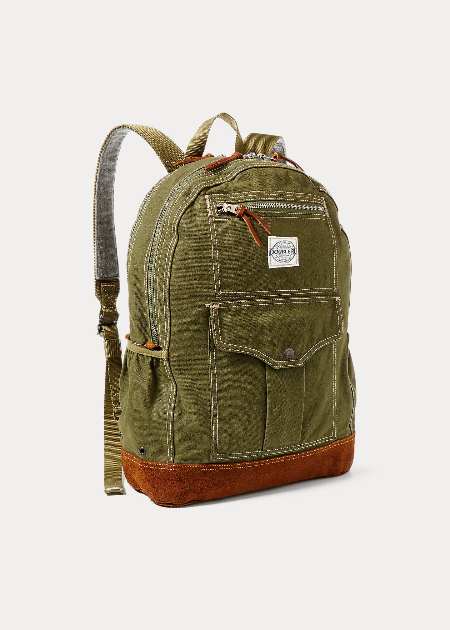 Top handle with a 3" drop. Two adjustable webbed shoulder straps with felt backs. Two two-way zip compartments. Zip pocket and a snapped flap pocket at the front. Elasticized side pocket with metal grommets. "Double RL Sporting Goods and Equipment Co." stamp at the front. Fully lined interior. Interior D-ring, padded laptop sleeve, and mesh zip pocket. 15" H x 12" L x 3½" D. Weighs approximately 2 lbs., 2 oz. Shell: 65% cotton, 35% nylon. Bottom: 100% leather. Imported. Includes a dust bag.