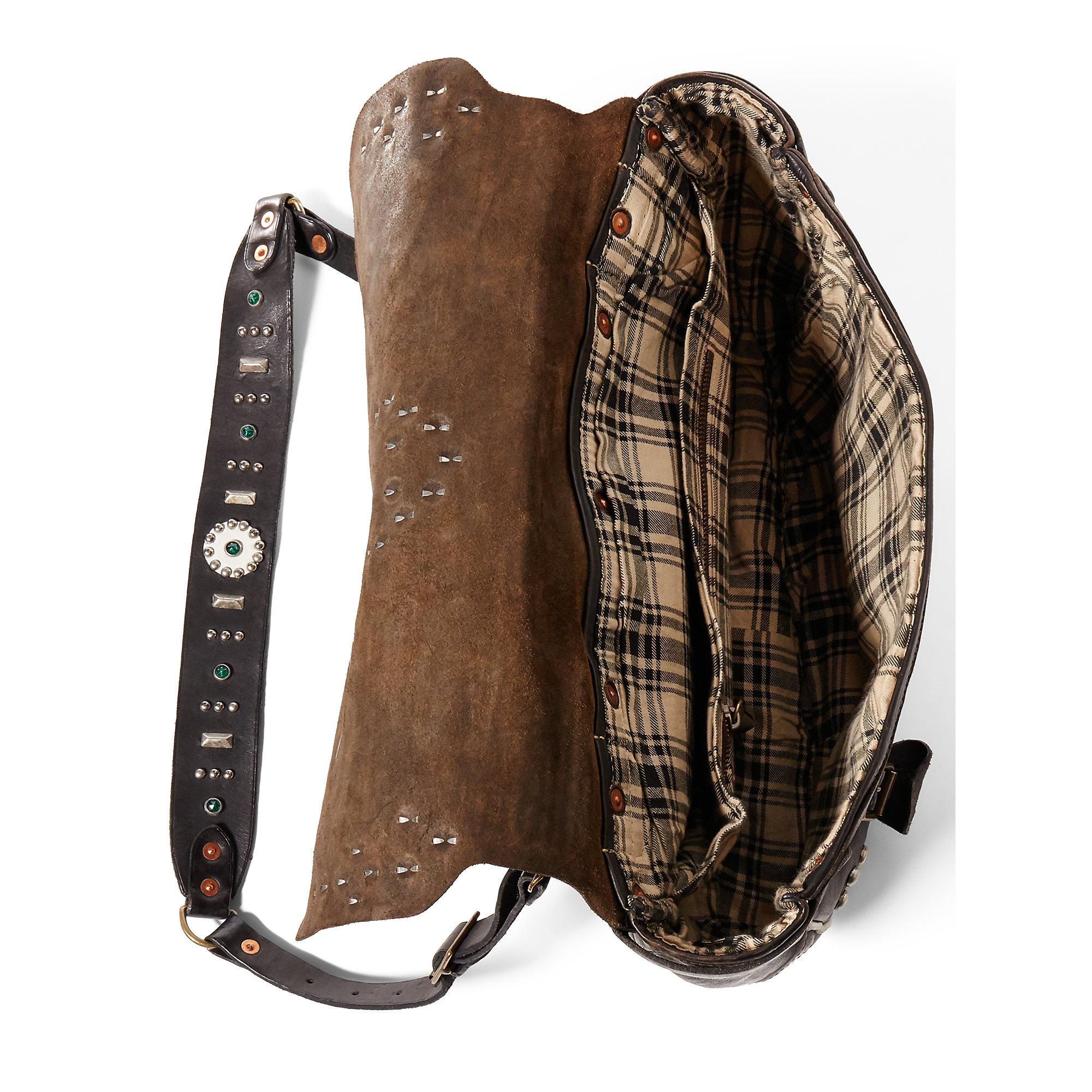Adjustable leather shoulder strap with an 18" maximum drop. Front flap secures with two buckled leather straps at the front. Leather tabs at both sides. Lined with plaid twill. Interior zip and slip pocket. 13" H x 16" L x 21⁄2" D. Weighs approximately 4 lbs. 3 oz. Leather, cotton. Italian leather.