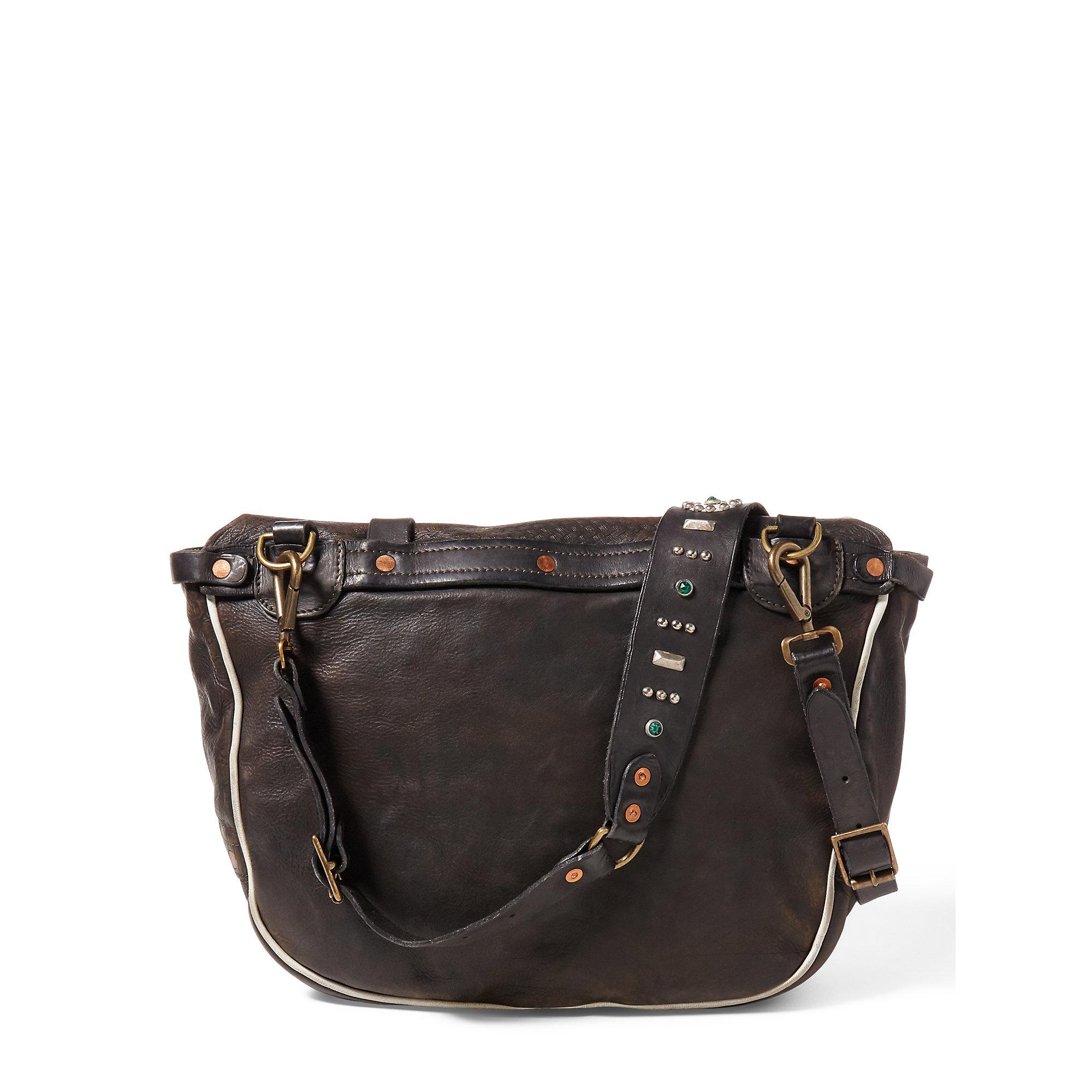 Vegetable-tanned Italian leather bag inspired by vintage motorcycle gear. Front flap embossed with a basket-weave pattern. Glass beads and American-made studs applied by hand.