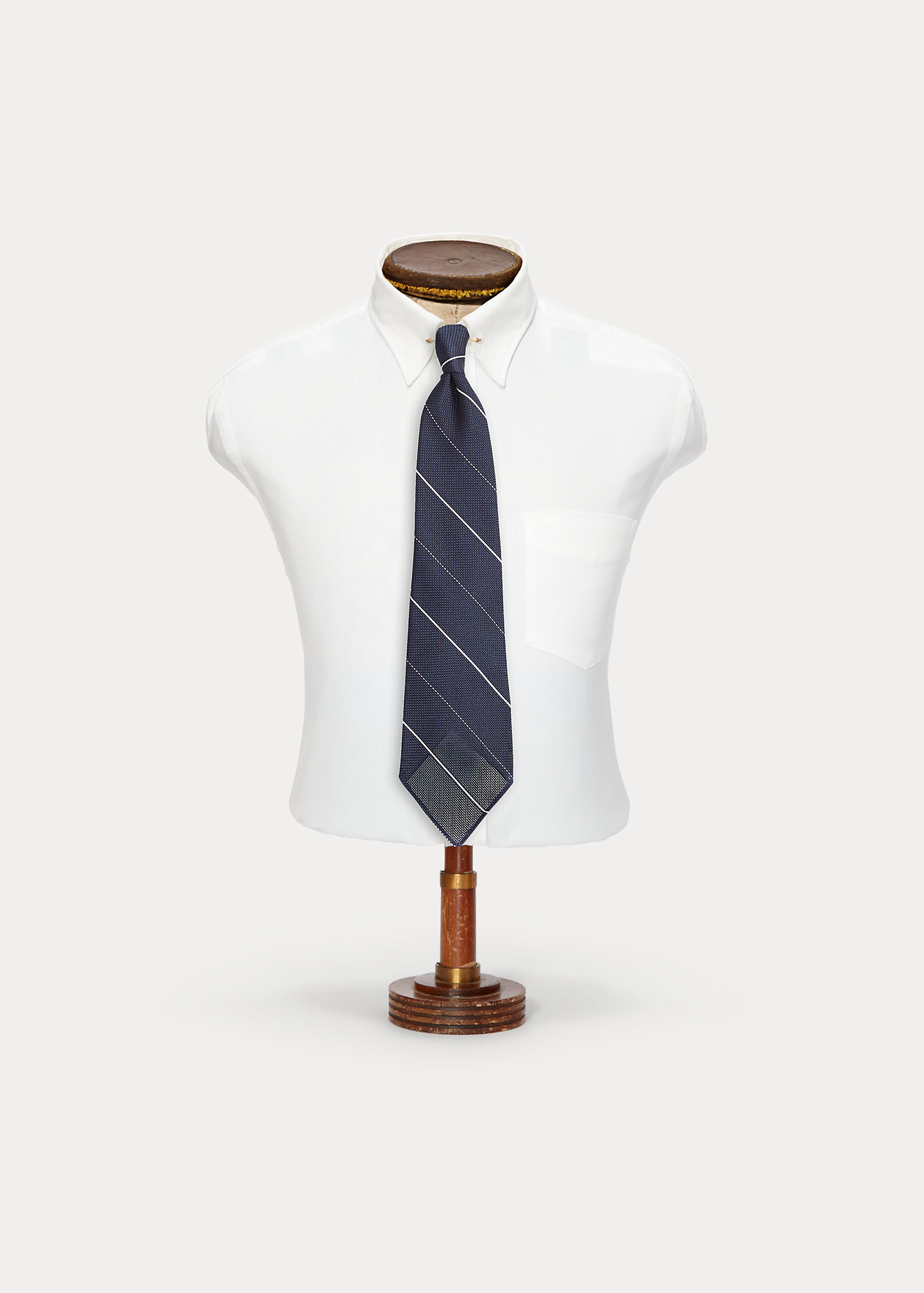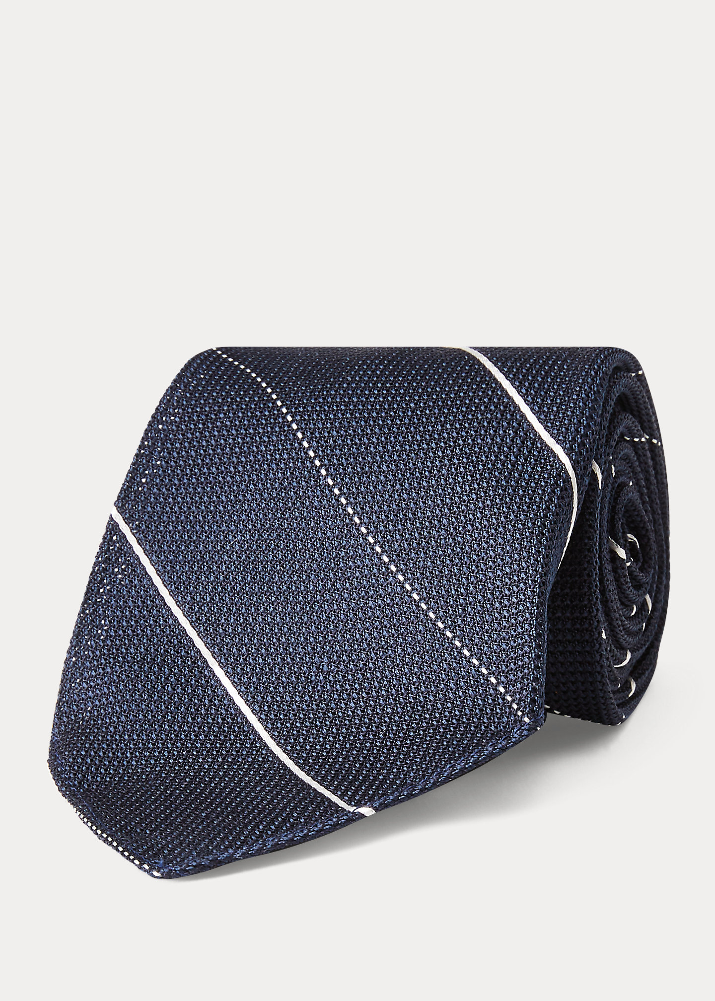 Based on neckwear from the '40s and '50s. Made from silk jacquard with a repp-stripe pattern. Cut on a 45-degree bias so it will never twist or turn. Untipped to maintain its vintage character.