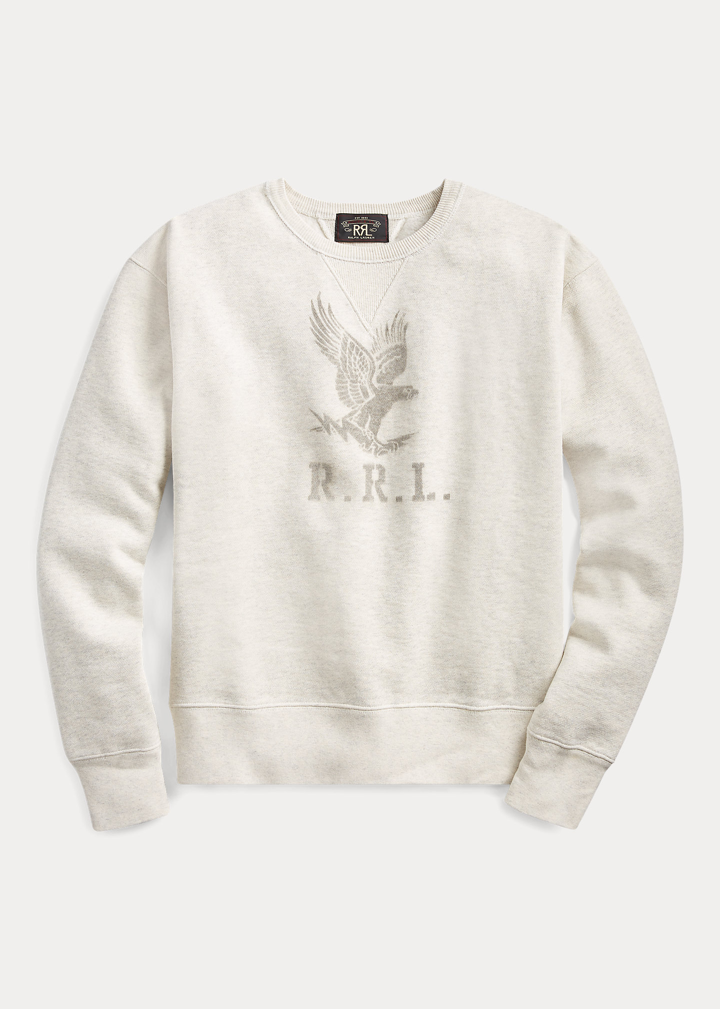 Boxy fit with straight armholes. Size medium has a 25" front body length, a 20½" shoulder, a 43" chest, and a 34" sleeve length. Sleeve length changes 1" between sizes. Crewneck with a double V-inset. Long sleeves with ribbed cuffs. An eagle and "R.R.L." pigment-printed at the center front. Ribbed hem. 91% cotton, 9% polyester. Machine washable. Imported.