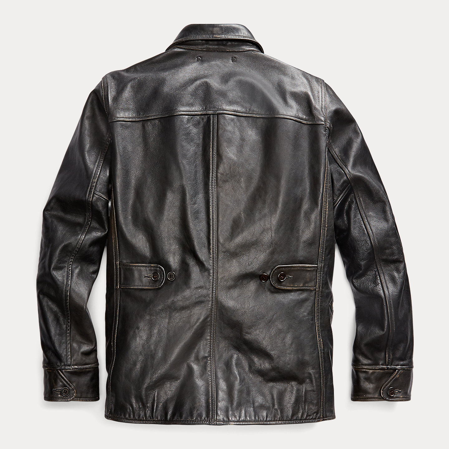 Slim-fitting coat made from lightweight, vegetable-tanned leather. Buttoned tabs at the back waist for an adjustable fit. Body is lined with cotton moleskin.