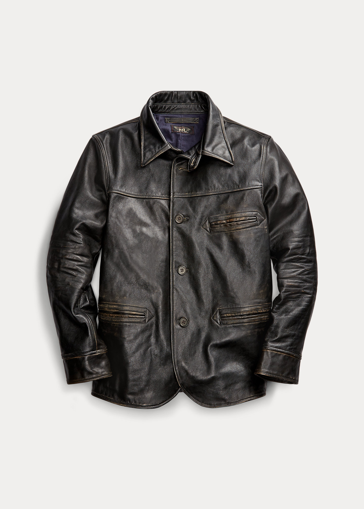 Slim fit. Size medium has a 28½" front body length, a 27½" back body length, an 18¾" shoulder, a 45¾" chest, and a 34½" sleeve length. Sleeve length changes 1" between sizes. Point collar. Buttoned throat latch. Buttoned placket. Corozo buttons. Long sleeves with buttoned barrel cuffs. Ventilating metal grommets at the underarms. Left chest welt pocket. Two front waist welt pockets. Buttoned tabs at the back waist. Fully lined. Body is lined with cotton moleskin. Shell: leather. Body lining: cotton. Sleeve lining: cupro, cotton. Dry clean by leather specialist. Imported. Due to the natural characteristics of this material, the coloring may rub off onto fabrics and upholstery.