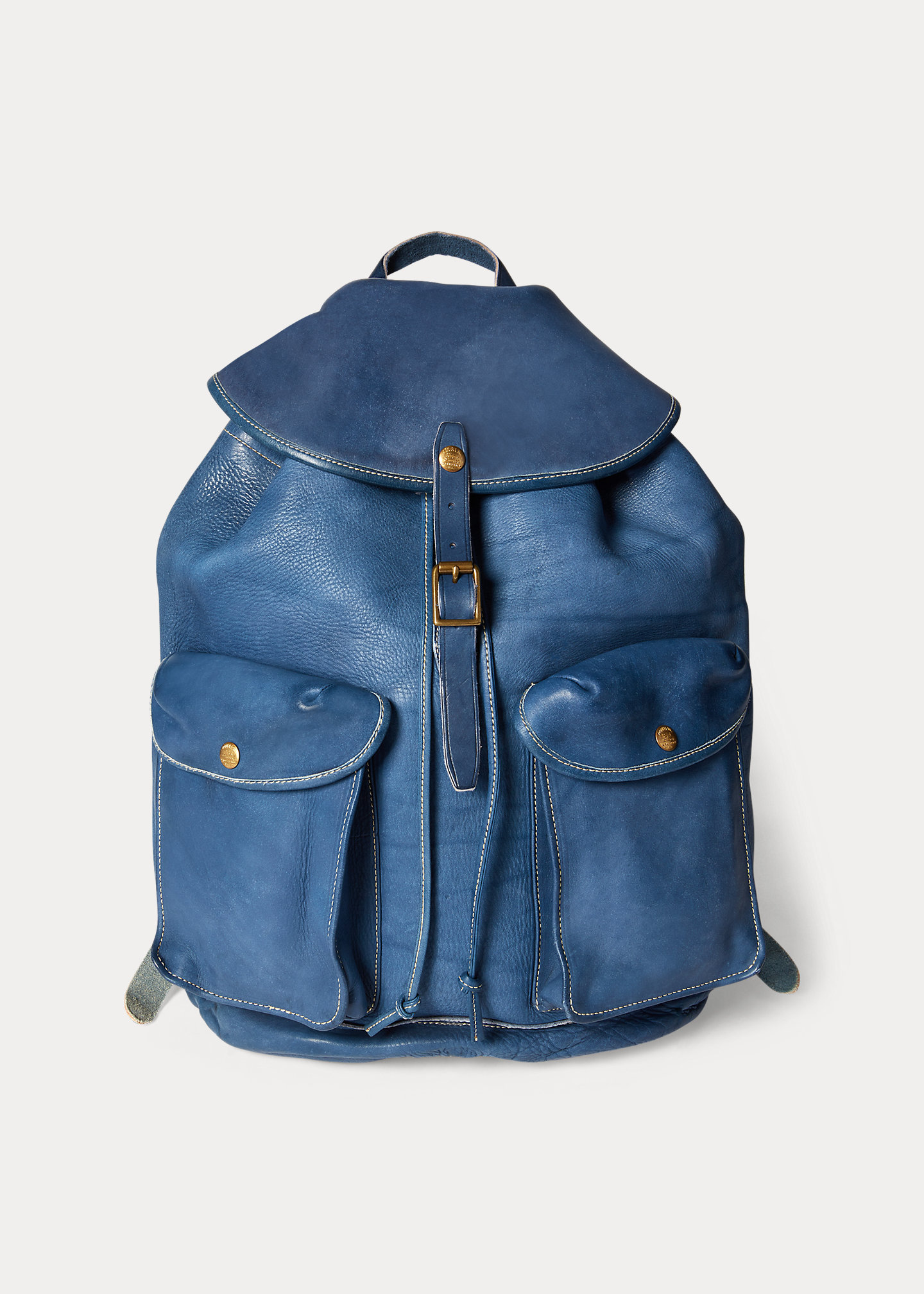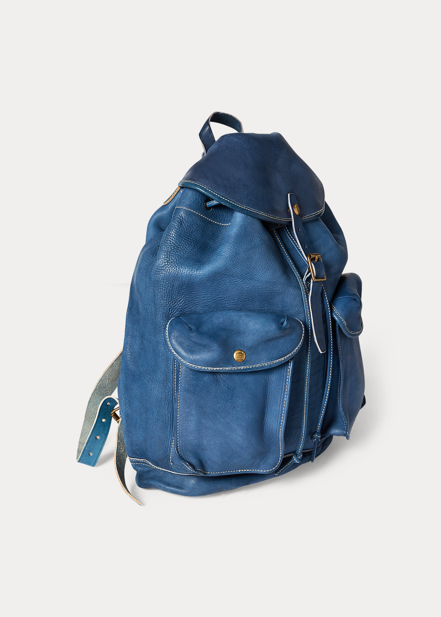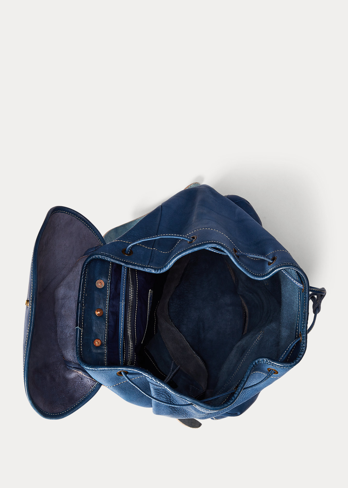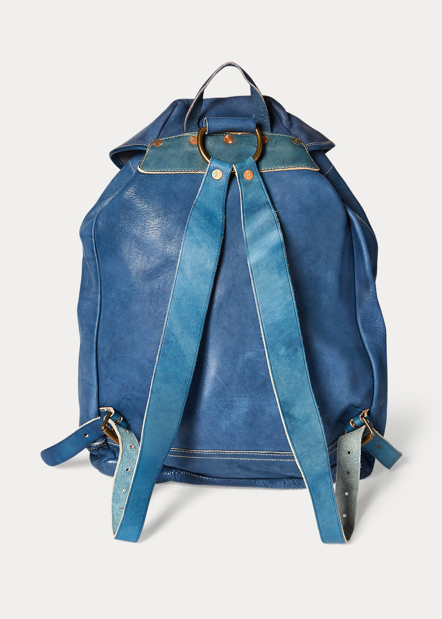 Made from full-grain cowhide. Dyed with true indigo and washed. Custom hardware. Adjustable shoulder straps.