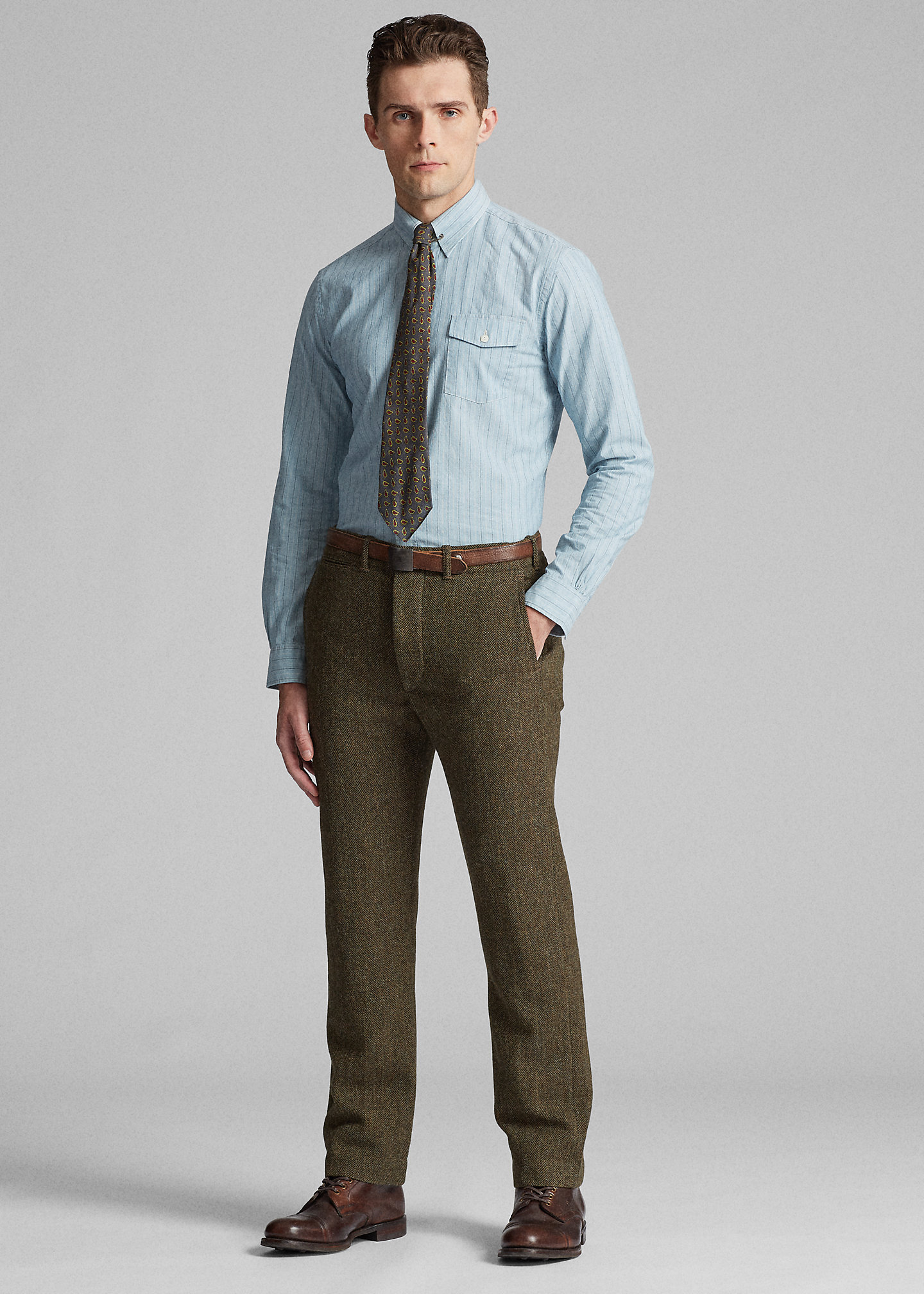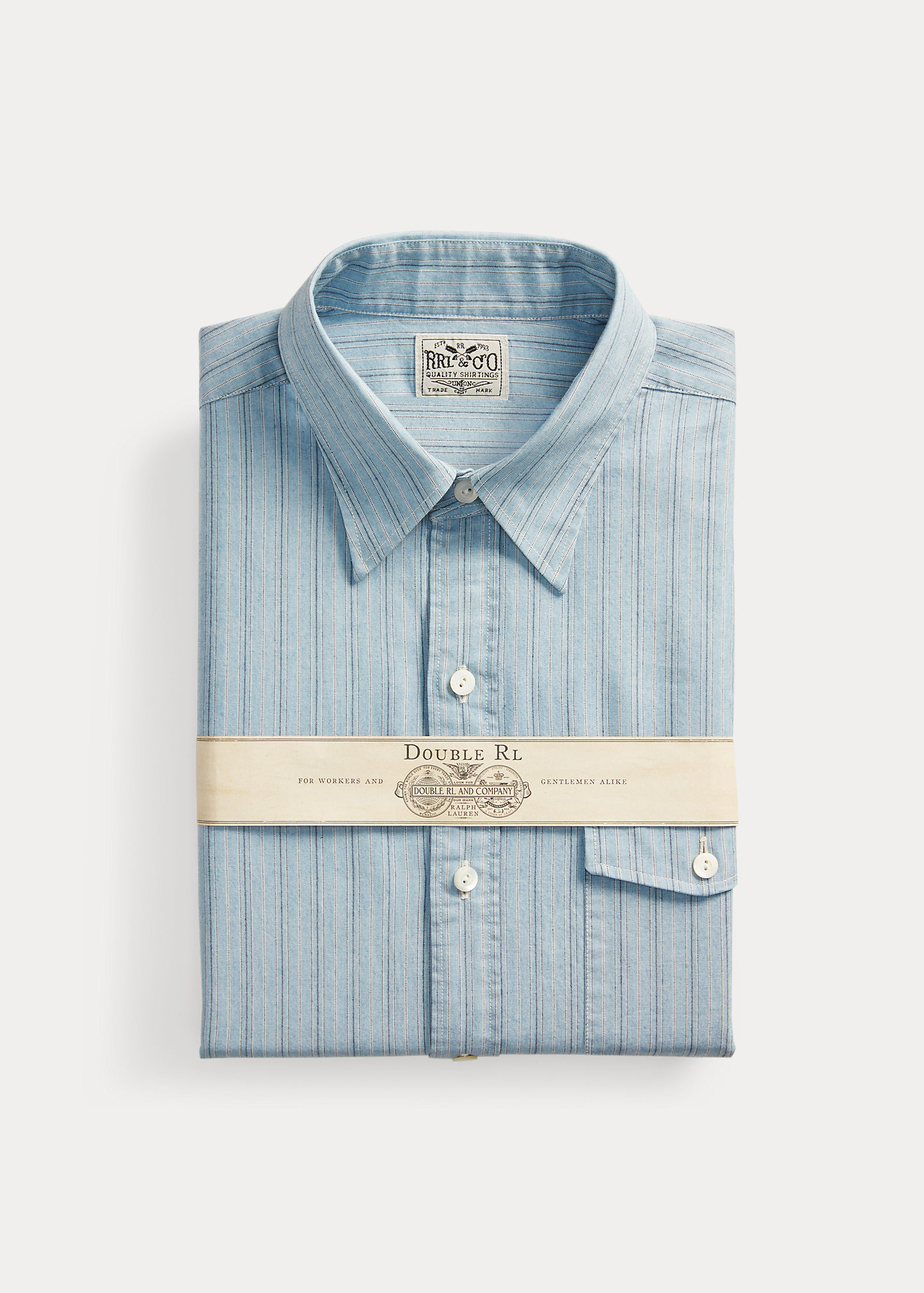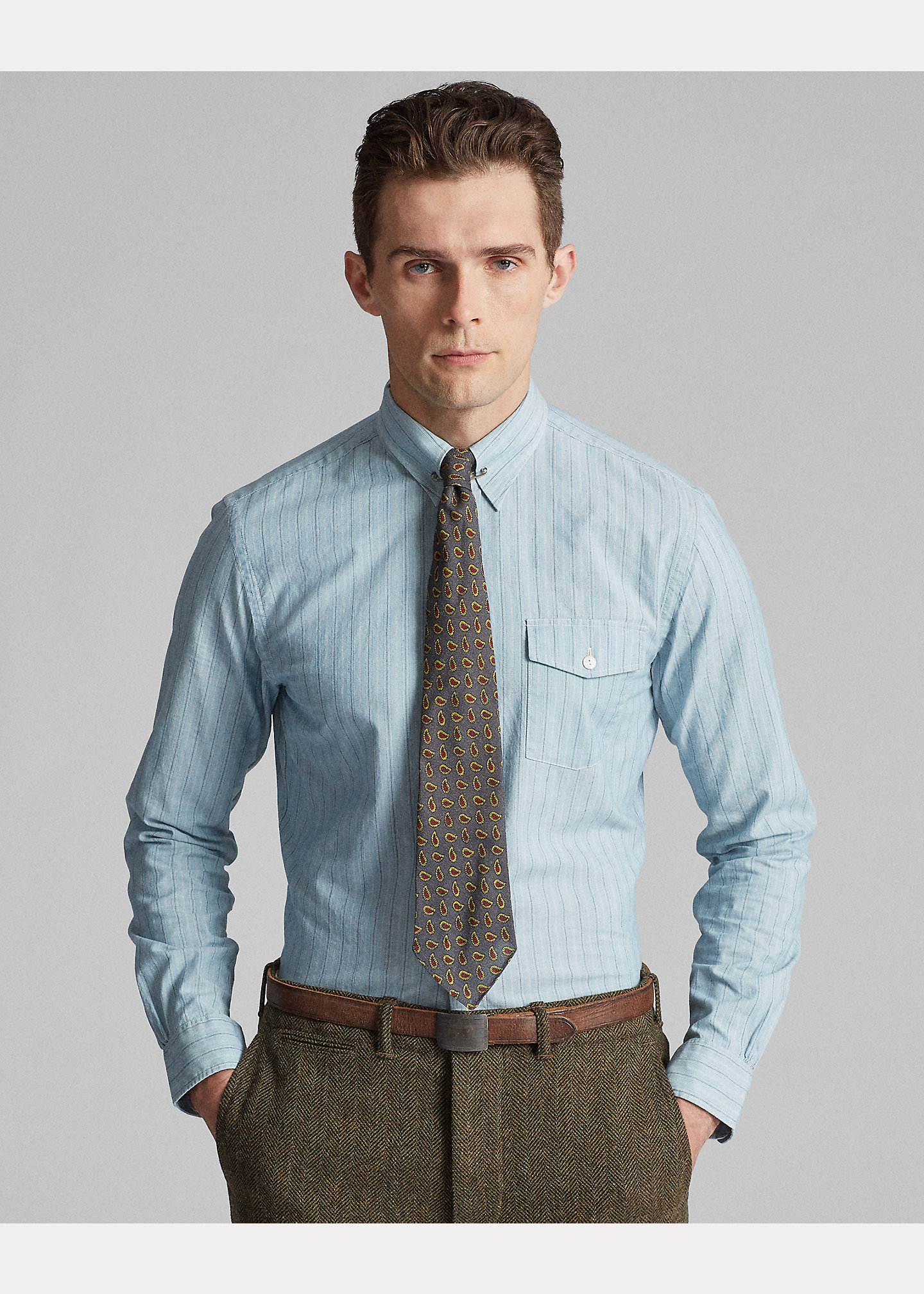 Slim-fitting dress shirt made from lightweight, yarn-dyed cotton. Vintage-inspired stripe pattern. Buttoned pocket at the left chest. Genuine mother-of-pearl buttons.