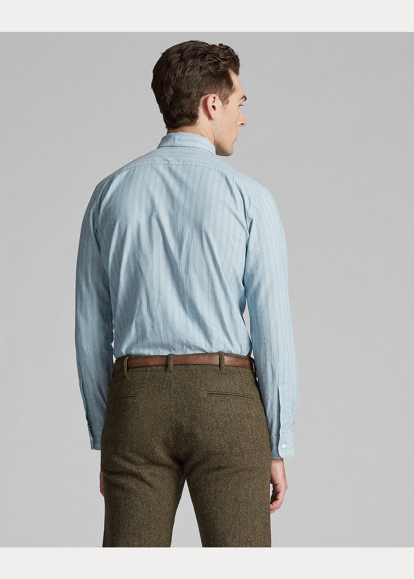 Slim fit. Size medium has a 30½" back body length, an 18" shoulder, a 42¾" chest, and a 34¾" sleeve length. Sleeve length is taken from the center back of the neck and changes ¾" between sizes. Point collar. Buttoned placket. Genuine mother-of-pearl buttons. Long sleeves with buttoned barrel cuffs. Left chest buttoned pocket. Cotton. Machine washable. Imported.