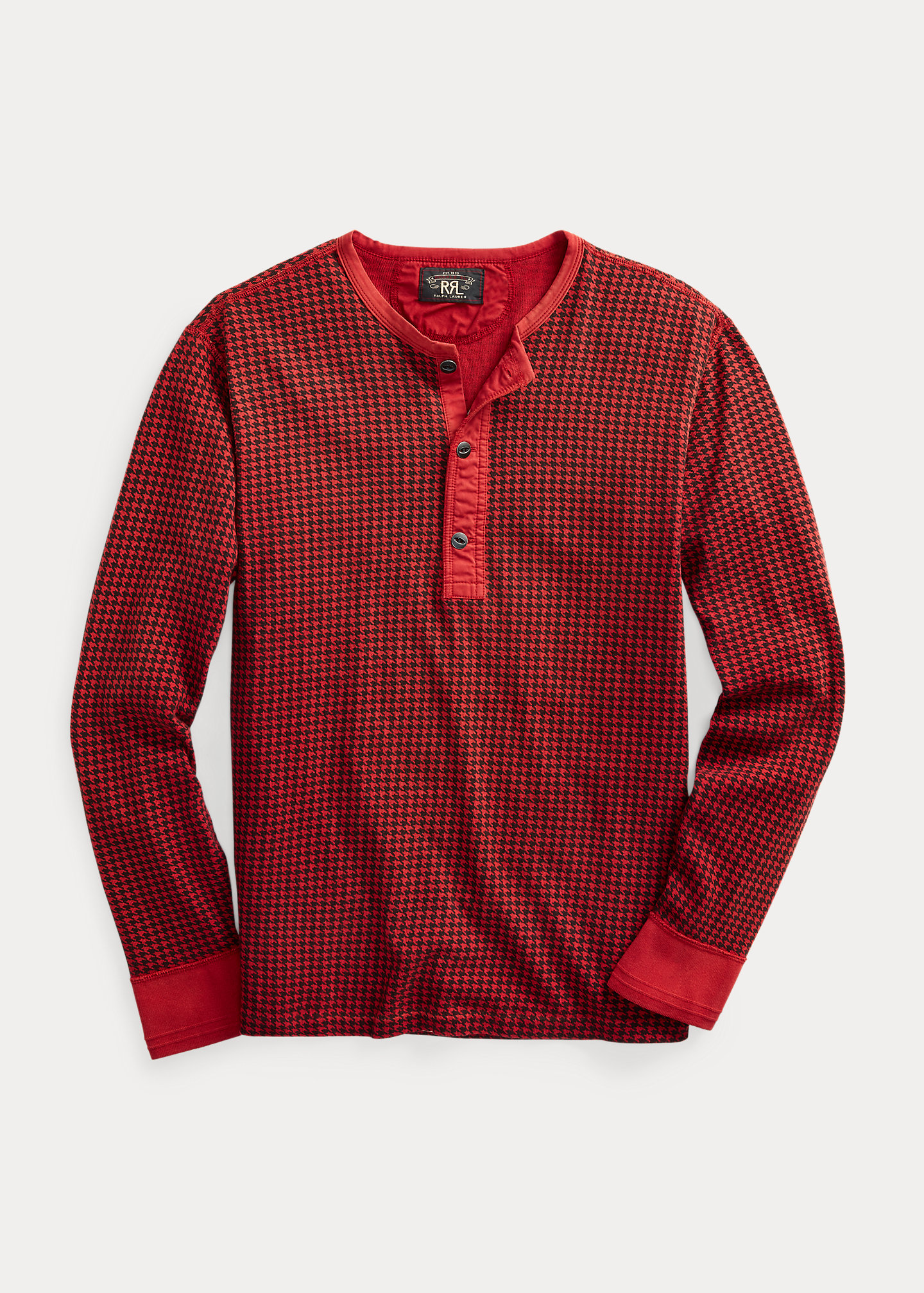 Standard-fitting Henley shirt cut from cotton jersey. Printed with a houndstooth pattern and then garment-dyed red. Metal fisheye buttons. Washed for added softness.
