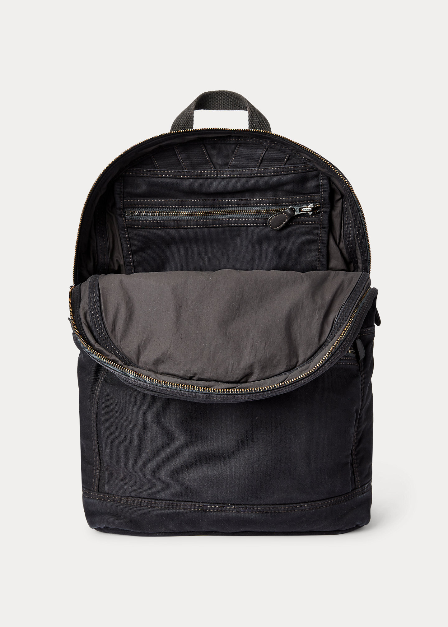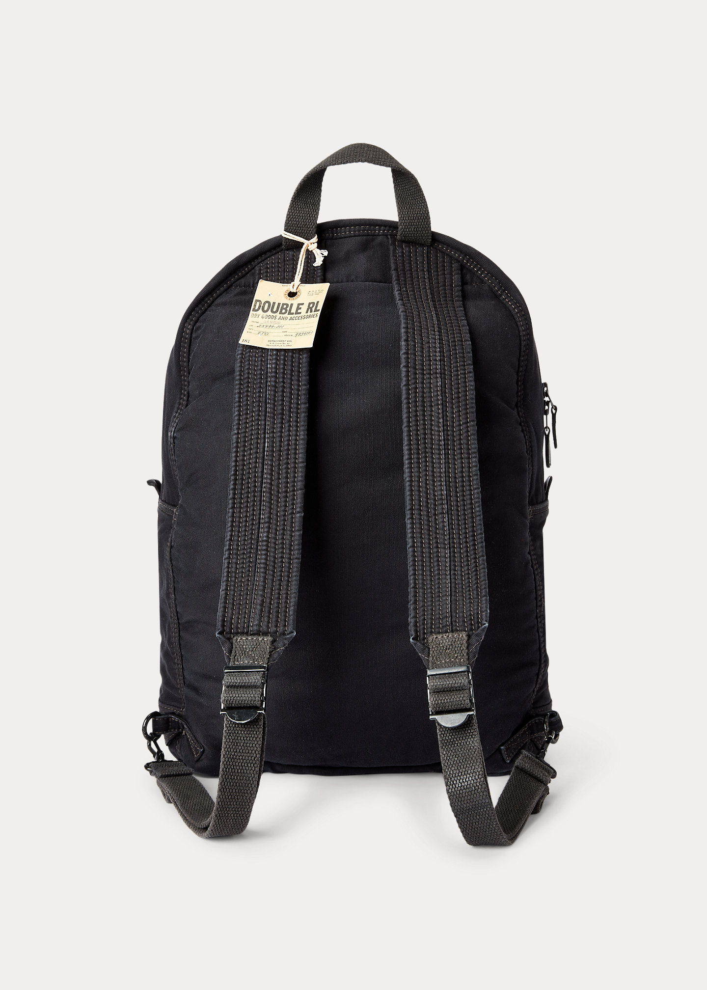 Canvas top handle with a 3¼" drop. Adjustable buckled shoulder straps. Two-way top zip closure with leather zipper pulls. Front zip pocket and interior zip pocket with leather zipper pulls. Embroidered "RRL" patch at the front. Lined with poplin. 17½" H x 11¾" L x 7" D. Cotton. Imported.