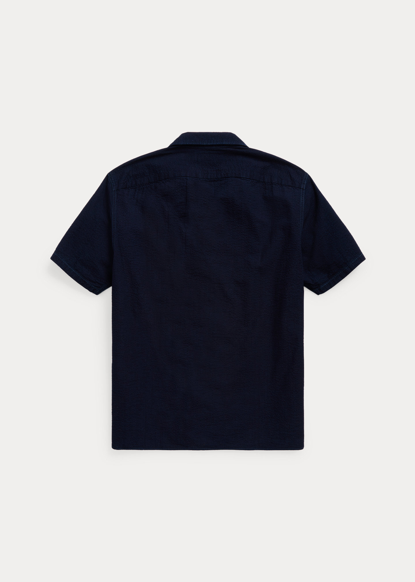 Made from lightweight cotton seersucker. Buttoned pockets at the chest. Dyed with true indigo and washed.