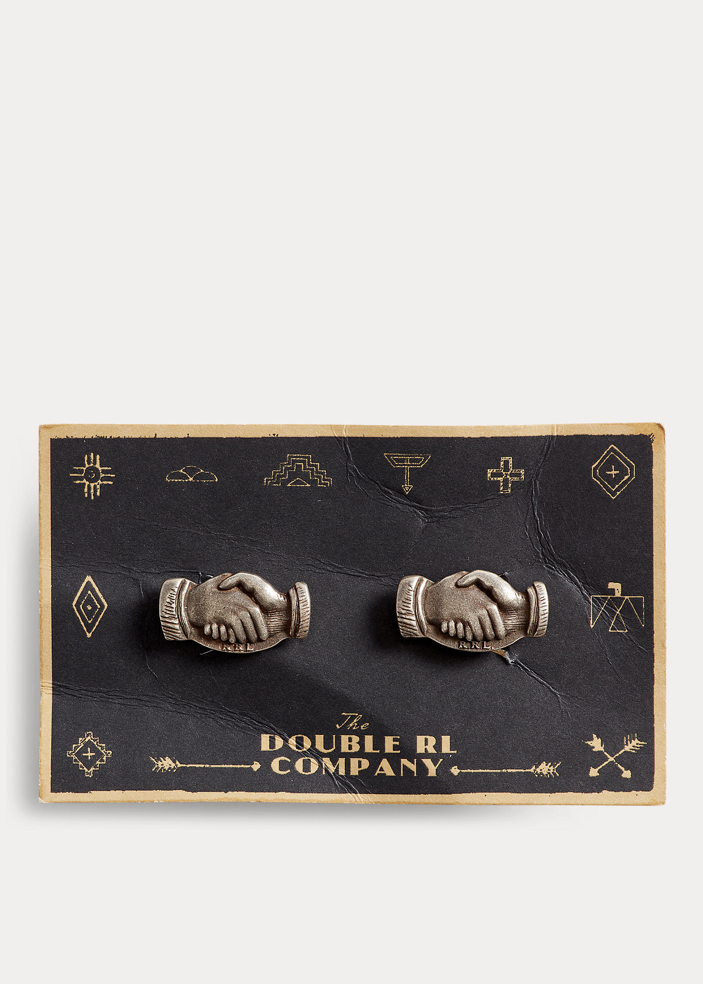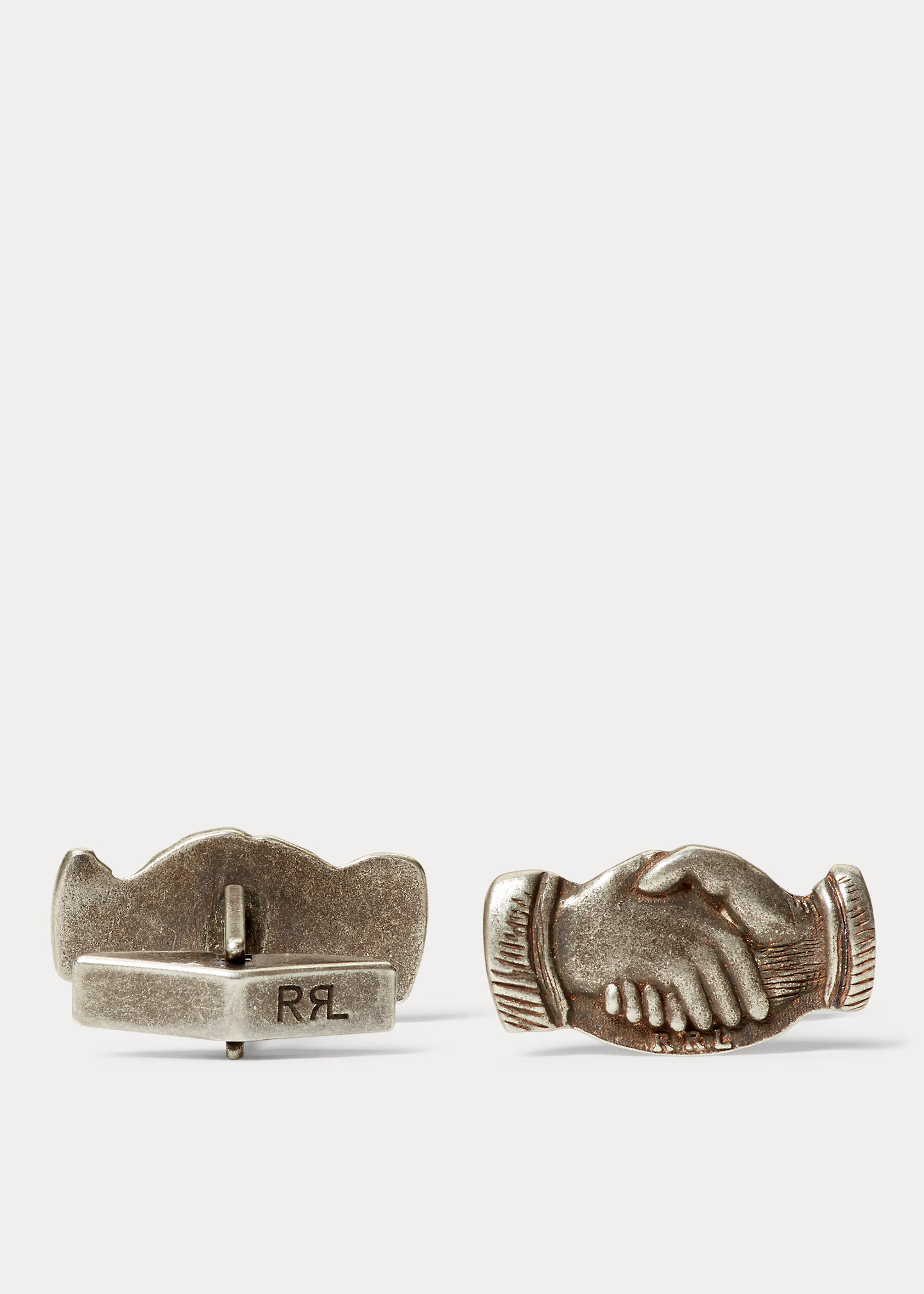 Silver-plated cuff links. Handshake motif and "R.R.L" engraved at the front. Comes in a signature box and with a dust bag.