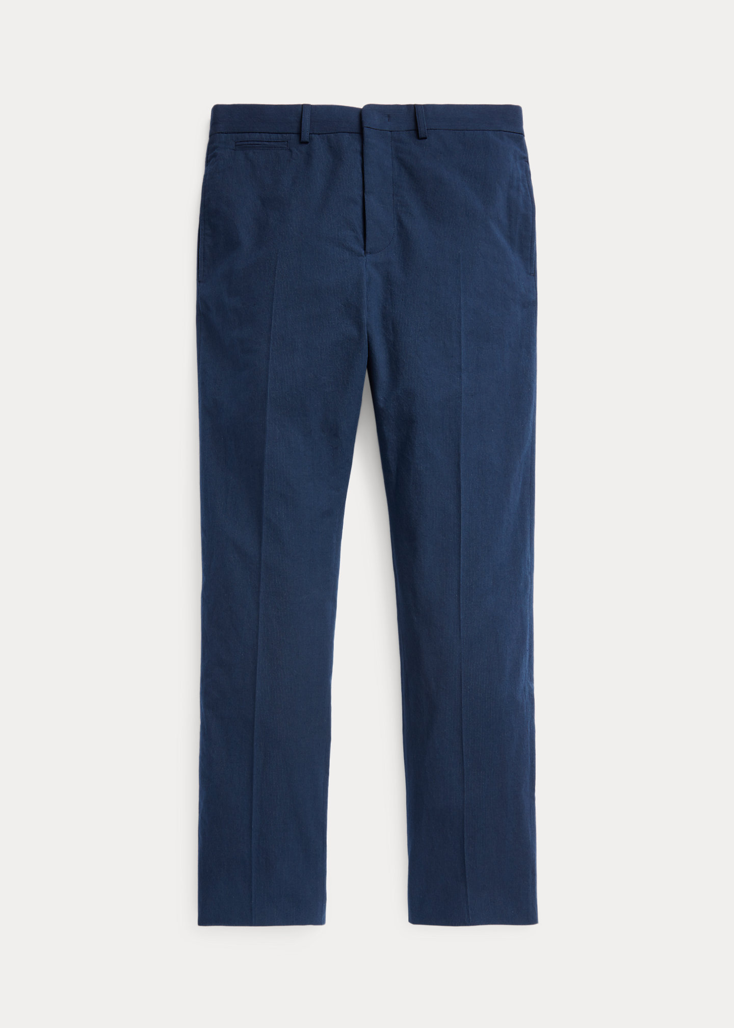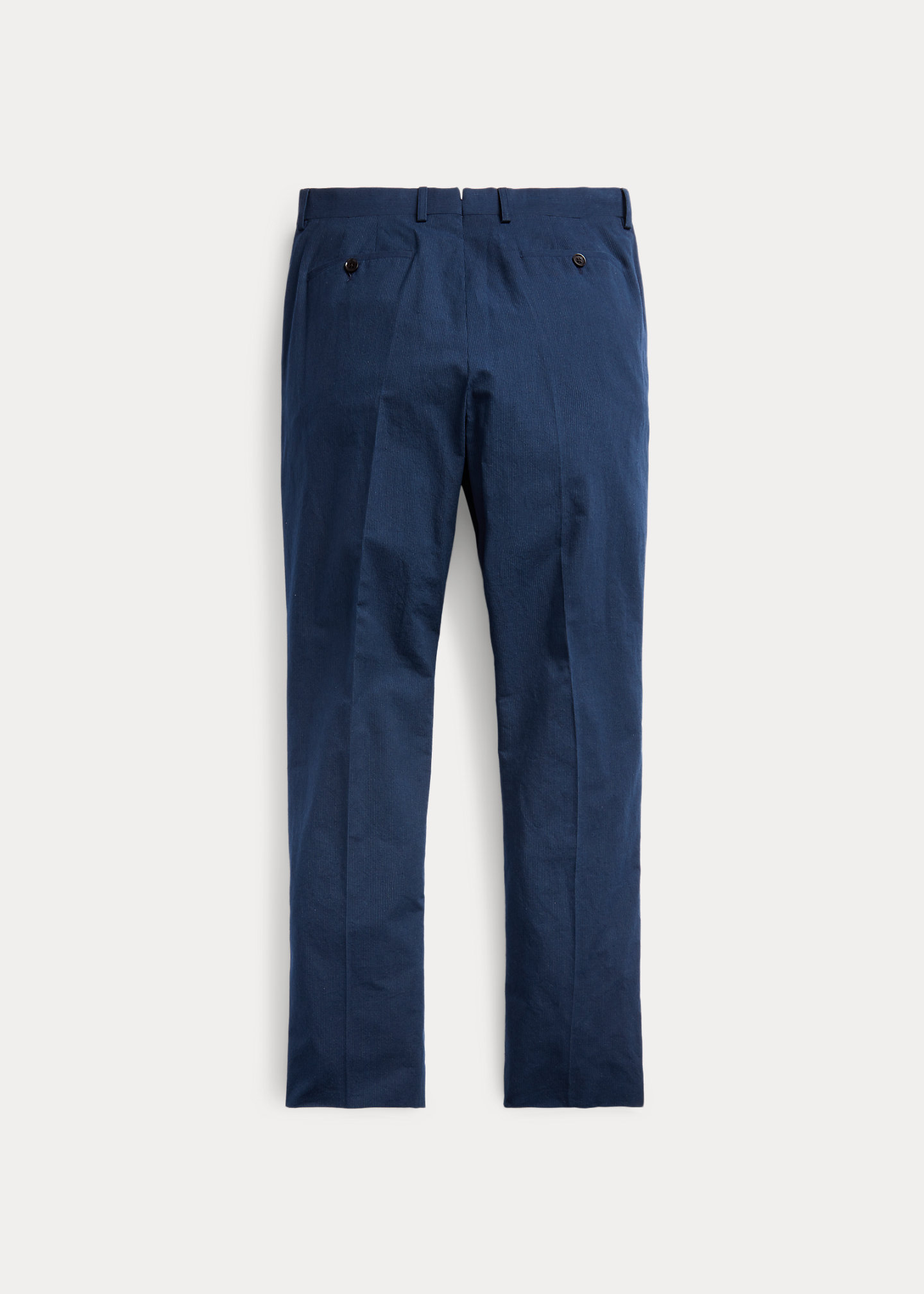 Slim fit. Size 32W has a 10¼" rise and a 15½" leg opening. Belt loops. Button fly with a buttoned closure. Curtain waistband. Interior buttons for braces. Corozo buttons. Side on-seam pockets. Right hip coin pocket. Two back buttoned pockets. Lined to the knees. Trouser comes unhemmed with a 38" inseam. Alterations available in Ralph Lauren retail stores. Shell: 100% cotton. Lining: 51% cotton, 49% viscose. Dry clean. Made in Italy. Dyed with true indigo, which may rub off onto fabrics, leather, and upholstery. Model is 6'1"/185 cm and wears a size 32W.