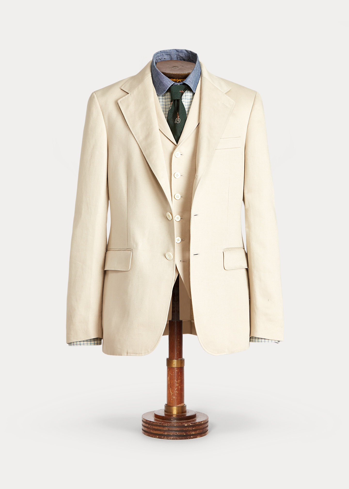 Size 40R has a 29½" back body length, an 18¼" shoulder, and an 18¼" sleeve inseam. Notch lapels. Buttonhole at the left lapel. Three-roll-two silhouette. River-shell buttons. Three-button cuffs with unfinished buttonholes ready for custom-tailoring. Left chest welt pocket. Two front waist flapped pockets. Single vent. Lined at the back yoke and the sleeves. Alterations available in Ralph Lauren stores. Shell: 100% linen. Lining: 51% cotton, 49% viscose. Dry clean. Made in Italy. Model is 6'1"/185 cm and wears a size 40R.