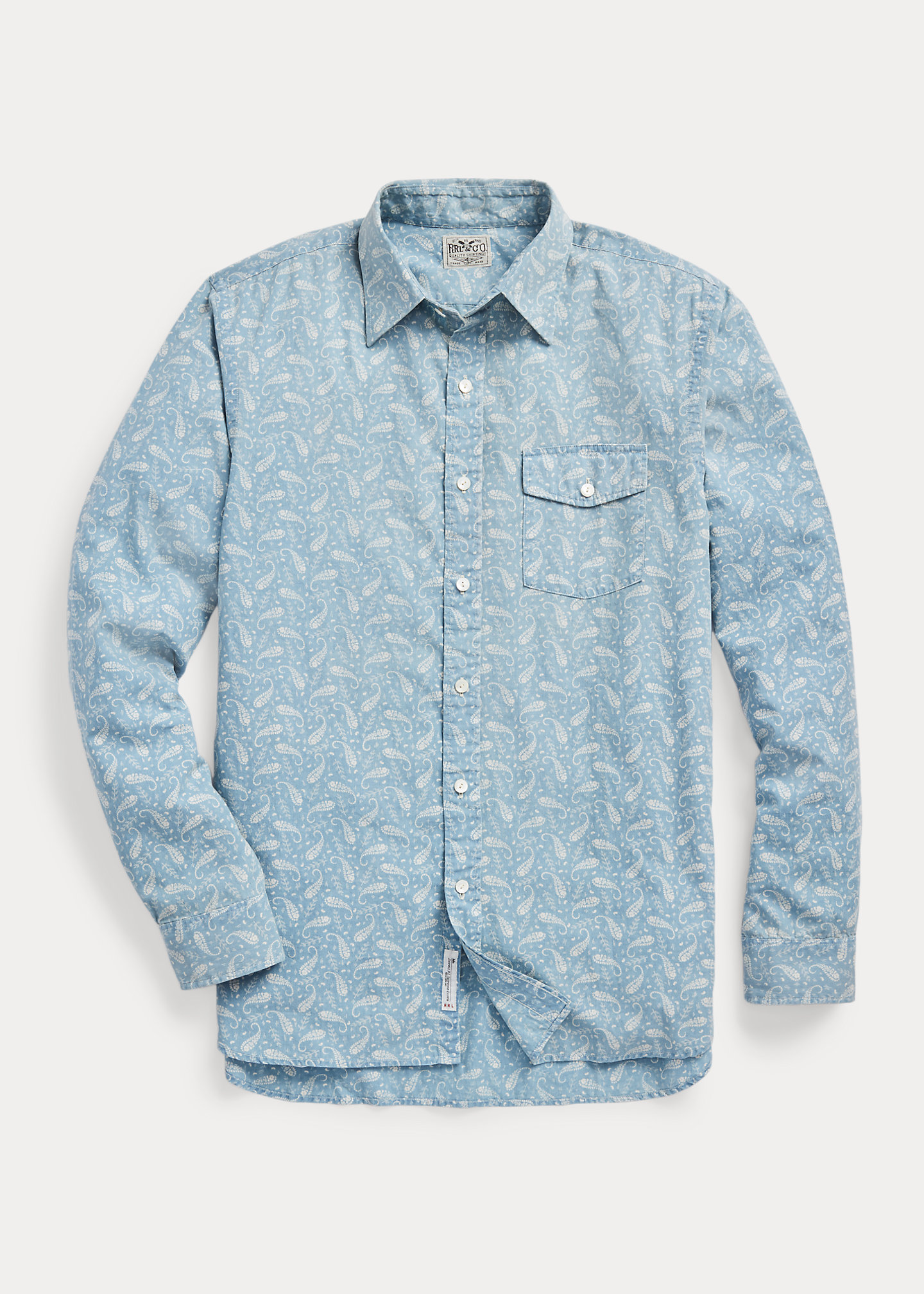 Slim-fitting shirt tailored from lightweight Japanese cotton fabric. Printed with a paisley motif. Dyed with true indigo. Authentic runoff chain-stitched construction at the side seams, which is based on workshirts from the '20s and '30s. Genuine mother-of-pearl buttons.