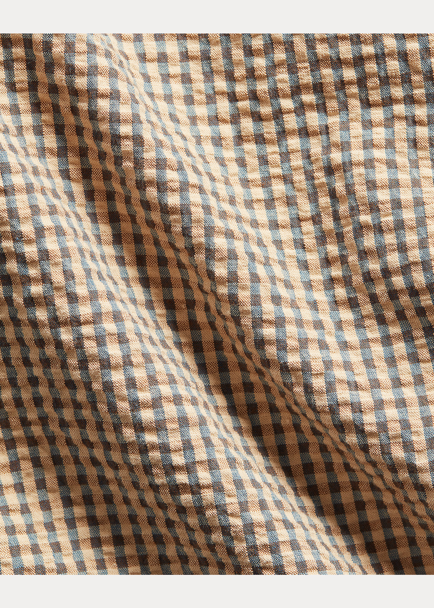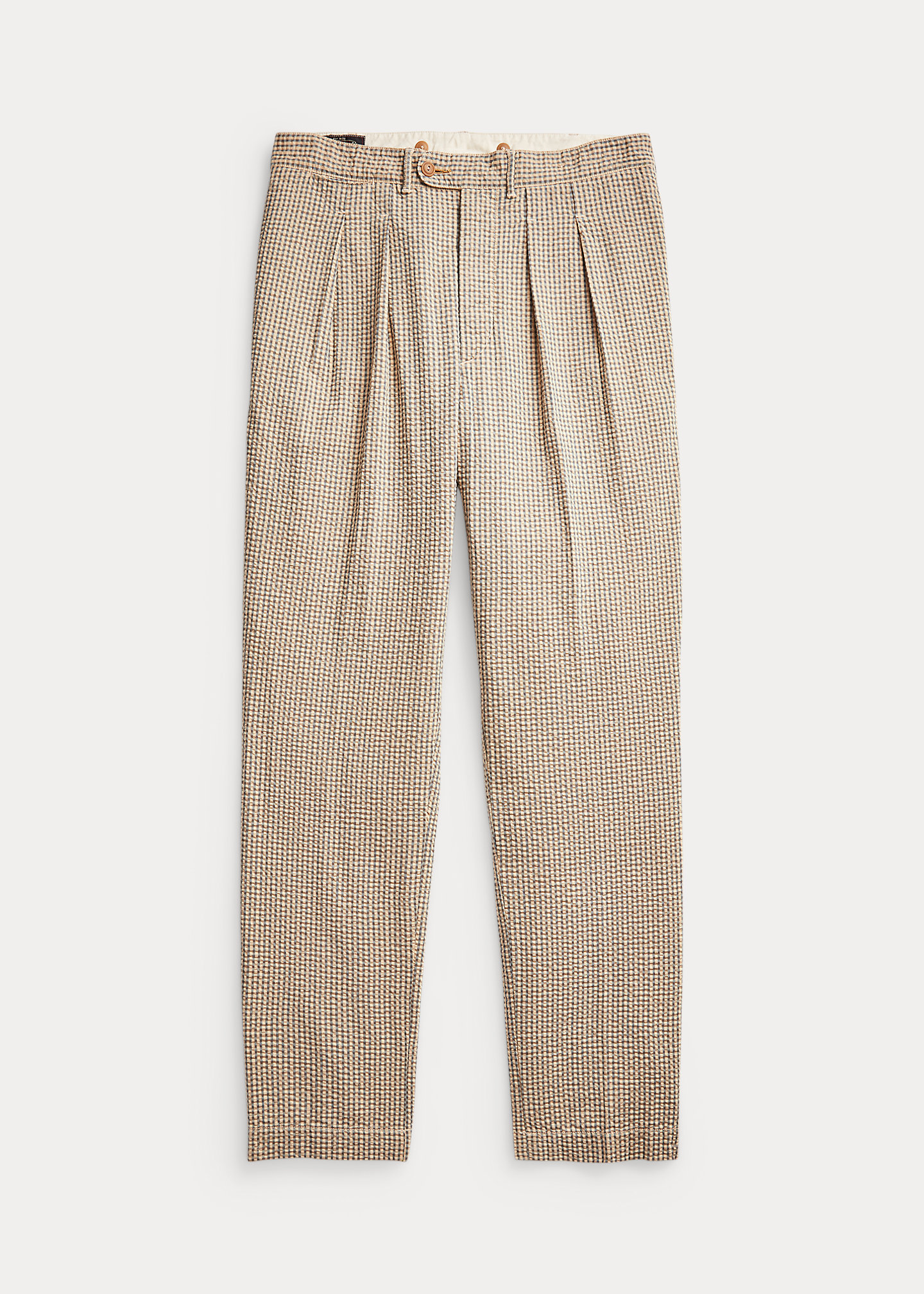 Made from Japanese cotton seersucker. Double-pleated front. Washed for softness. Coordinating vest available.