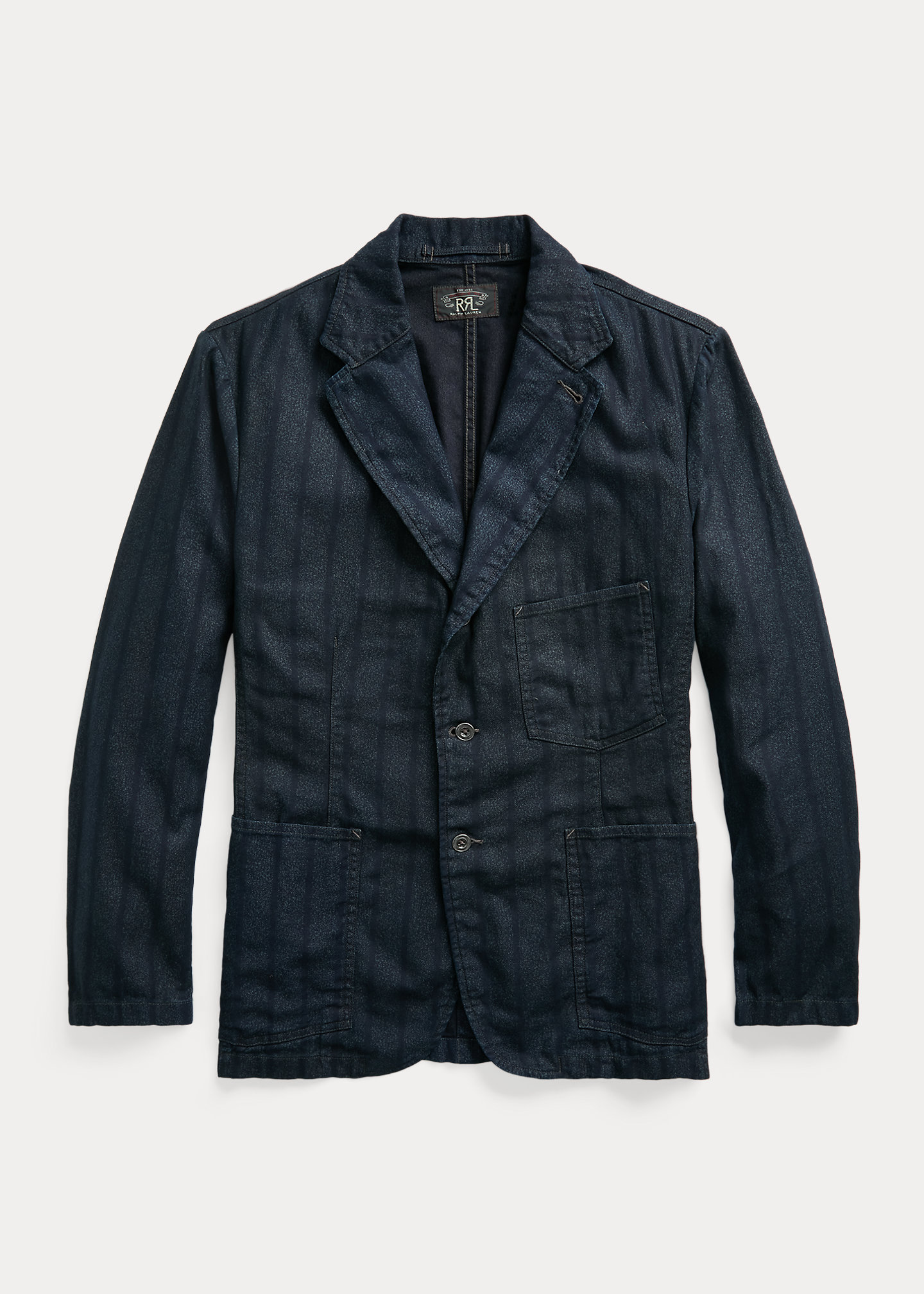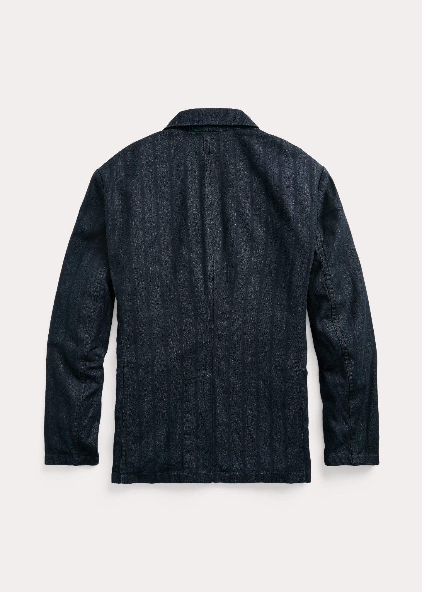Size medium has a 29¾" front body length, a 28¾" back body length, an 18½" shoulder, a 44¾" chest, and a 34" sleeve length. Sleeve length changes 1" between sizes. Notch lapels. Buttonhole at the left lapel. Three-roll-two silhouette. Metal buttons. Long sleeves. Left chest patch pocket. Two front waist patch pockets. Two interior chest pockets. Single vent. Unlined. Cotton. Machine washable. Imported. Dyed with indigo, which may rub off onto fabrics, leather, and upholstery.